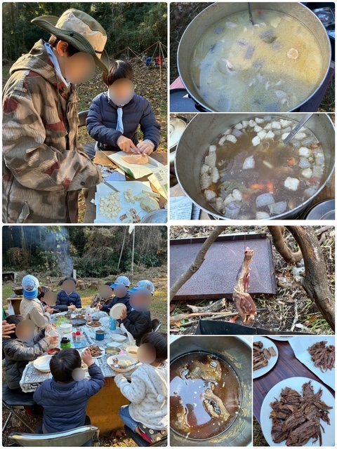 2025.12.7 野外調理 2025年12月8日 webmaster スカウトハウスで野外調理を行いました。本日のメニューはポリ袋ご飯とジビエ料理です。白米と潰したシュウマイと調味料を耐熱ビニール袋に入れ湯煎で炊きました。猪肉は味噌味の鍋、熊肉は醤油味の鍋、鹿肉は煮込み、アライグマ肉は吊し焼きでそれぞれ調理し食べ比べをしました。どれも独自の味で美味しかったです。珍しいお肉を食べ貴重な体験ができました。 投稿ナビゲーション 前の記事2025.11.23-24キャンプ次の記事12/21 餅つき大会