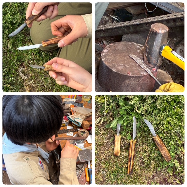本日のボーイ隊の活動は「ナイフ作り」でした。五寸釘を金槌で打って平らにする作業は、腕が疲れる力のいる作業でしたが、時々休みながら懸命に叩いていました。完成すると、庭の雑草や小枝で切れ味を確認していました。 休憩中には、来年度はどんな活動がしたいか意見を出し合いました。